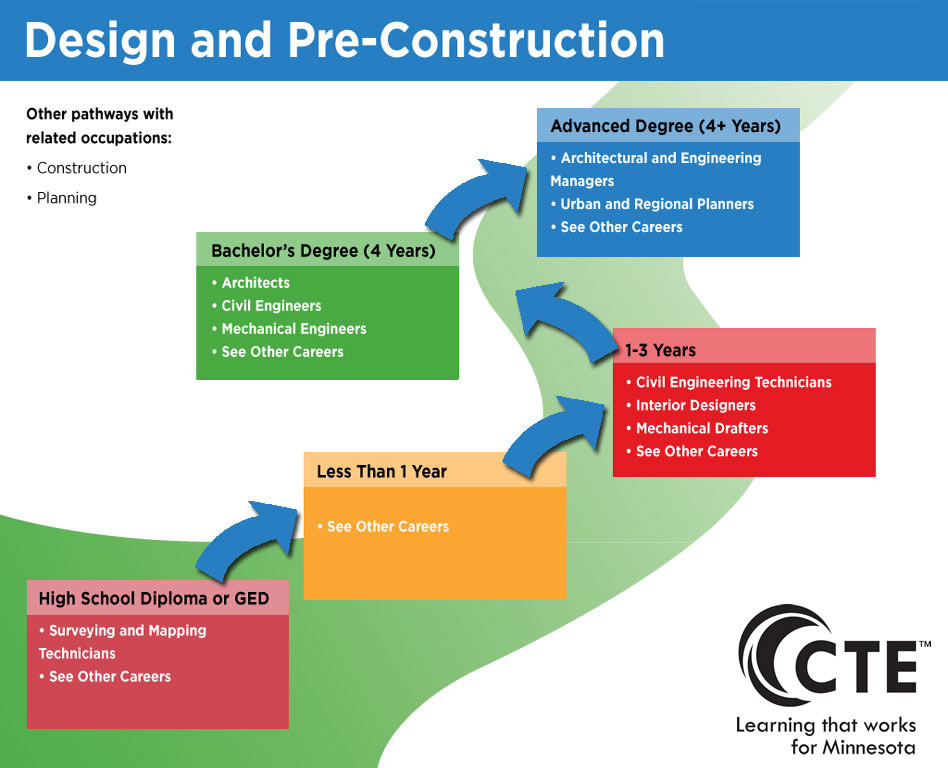 Some schools have career maps to show you how you can progress from studying to working at the highest level in that career field. Here is a career map for design & pre-construction: